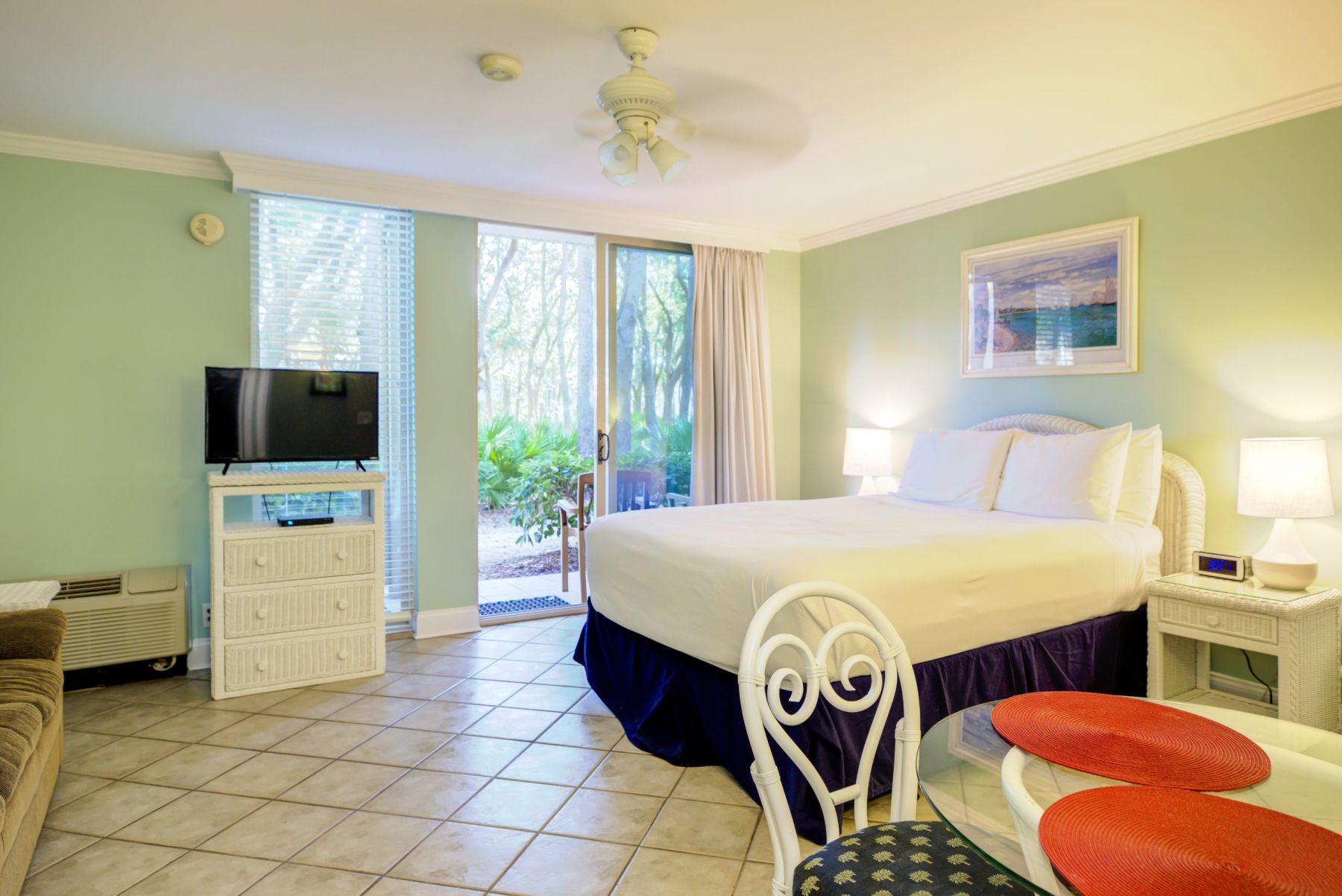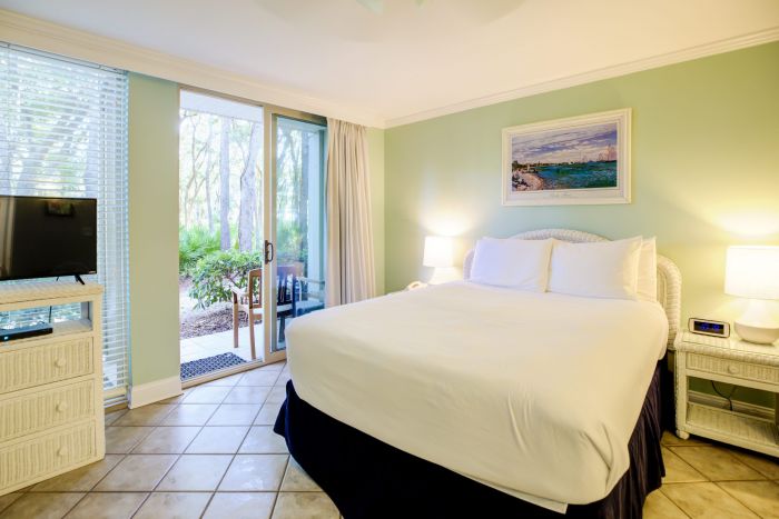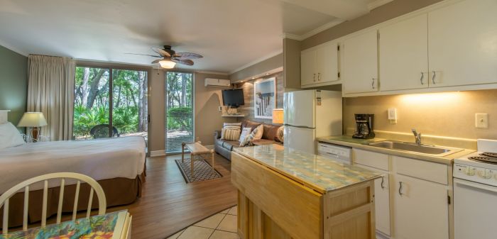 First floor only, ground level. Our deluxe 480 sq. ft. bottom floor Studio Villa offers spacious accommodations. Each Studio Villa features one queen bed, sitting area, mini kitchen and a full bath, ideal for one or two guests. Don’t settle for a plain hotel room, indulge yourself and enjoy the benefits of more space and more room amenities that come standard in our Studio Villas. Islandside Only.